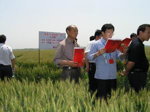 由河南省地神种业农科所培育的神麦2号(原泛麦5 号)是具备抗寒抗病抗倒多穗超高产特点的小麦新 品种。从今年开始,潘村湖农场拥有在皖东、皖北 和江苏的独家经营权。该场种植的神麦2号由于适 期播种,各项管理措施到位,目前长势喜人,丰收 在望。图为进入5月中旬以来,来自省内外的种业 界客户和农业科技人员纷纷来到该场,实地考察观 摩神麦2号等小麦品种生长情况的情景。(杨登宏 摄)