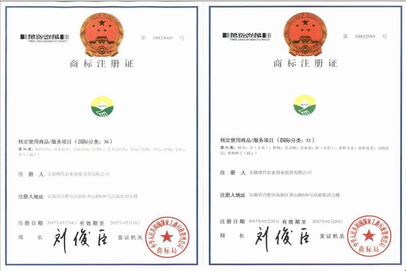 331,安徽现代农业创投公司收到国家商标局寄来的两款商标注册证:自主设计的投资金融、农业两大板块商标图案均喜获注册。