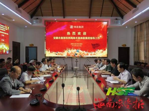 考察座谈会上,刘超简要介绍了安徽农垦历史沿革和改革发展情况,重点介绍了现代农业、投资金融、房地产三大主业发展态势。他对海垦神泉集团改革创新20多年取得的成绩表示赞扬,希望双方进一步加深交流,加快推进合作,实现互利共赢。王业侨对刘超一行来到海垦传经送宝、洽谈合作表示欢迎。他说,热带水果产业是海垦8大产业之一,海垦果业集团将以整合垦区芒果为起步,力争实现整合全国垦区水果资源,打响中垦果业品牌。琼皖垦区间的交流合作是贯彻全国农垦“三联”战略的有益尝试,希望双方能在果业产业发展方面强强联合、互促发展。